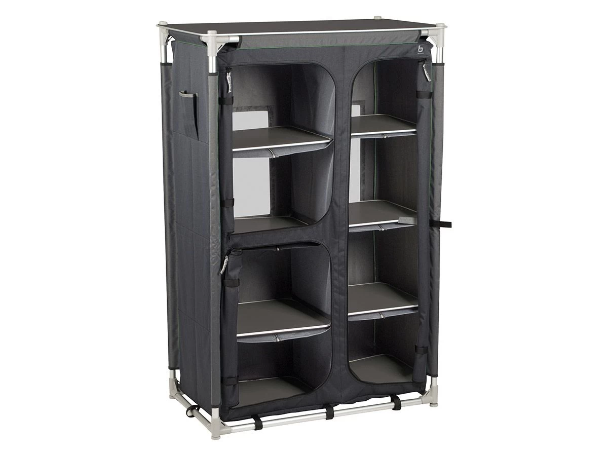Als je twijfelt of je een hangkast of een kast met legplanken moet kiezen, dan is de Bo-Camp Wollaston hang/legkast de perfecte campingkast. De rechterkant van de kast is voorzien van 4 legplanken, maar als je liever een hanggedeelte wilt gebruiken dan kun je deze legplanken eruit halen en kun je de kledingroede gebruiken.