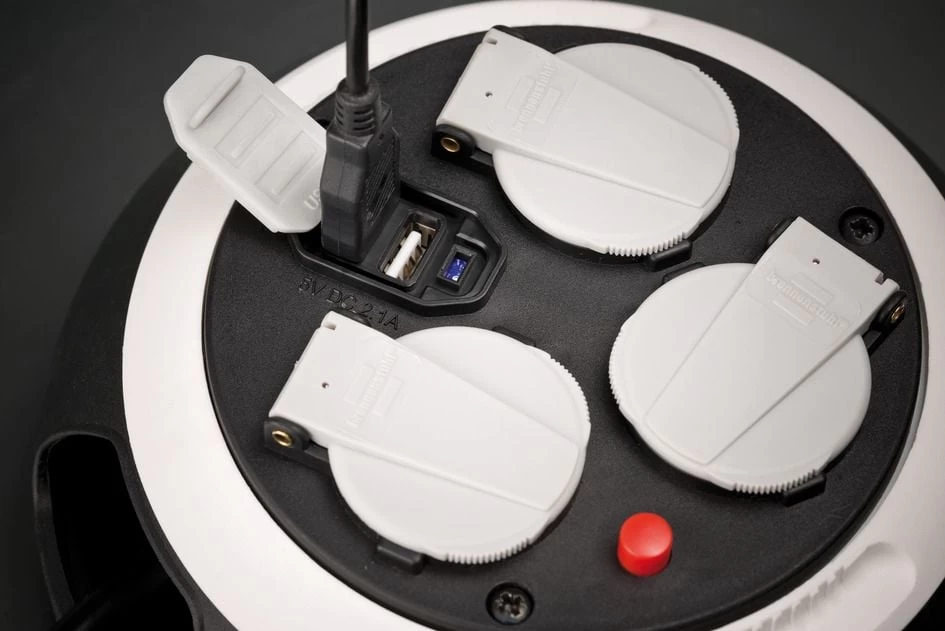 Een kabelhaspel is altijd handig om in huis te hebben en om mee te nemen naar de camping. Deze Comfort-Line kabelhaspel is voorzien van 3 meter verlengsnoer zodat je altijd bij het stopcontact kan. De kabelhaspel heeft 3 geaarde stopcontacten met een zelfsluitende klapdeksel en 2 USB-laadcontactdozen die stof- en vuilafstotend zijn. De USB-laadaansluitingen hebben een laadstroom van maximaal 2100 mA, voor snel laadproces.