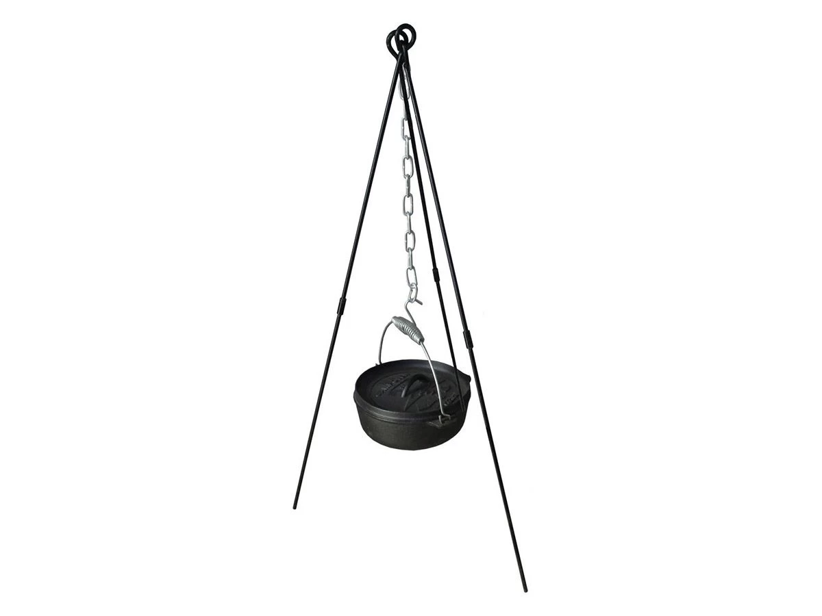 Een stevige driepoot barbecue standaard voor een kampvuurpot/pan. De driepoot is gemakkelijk op te zetten en af te breken.