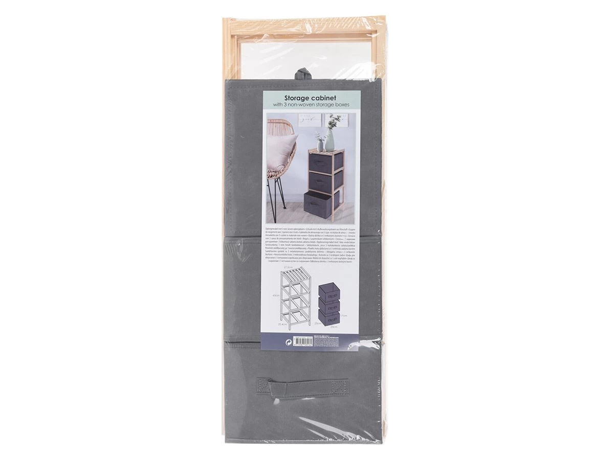 Het kastje heeft een houten frame met daarin drie stoffen lades. Het kastje heeft een afmeting van 27,5 x 25,4 x 65 cm en de lades hebben een afmeting van 25 x 25 x 17 cm.