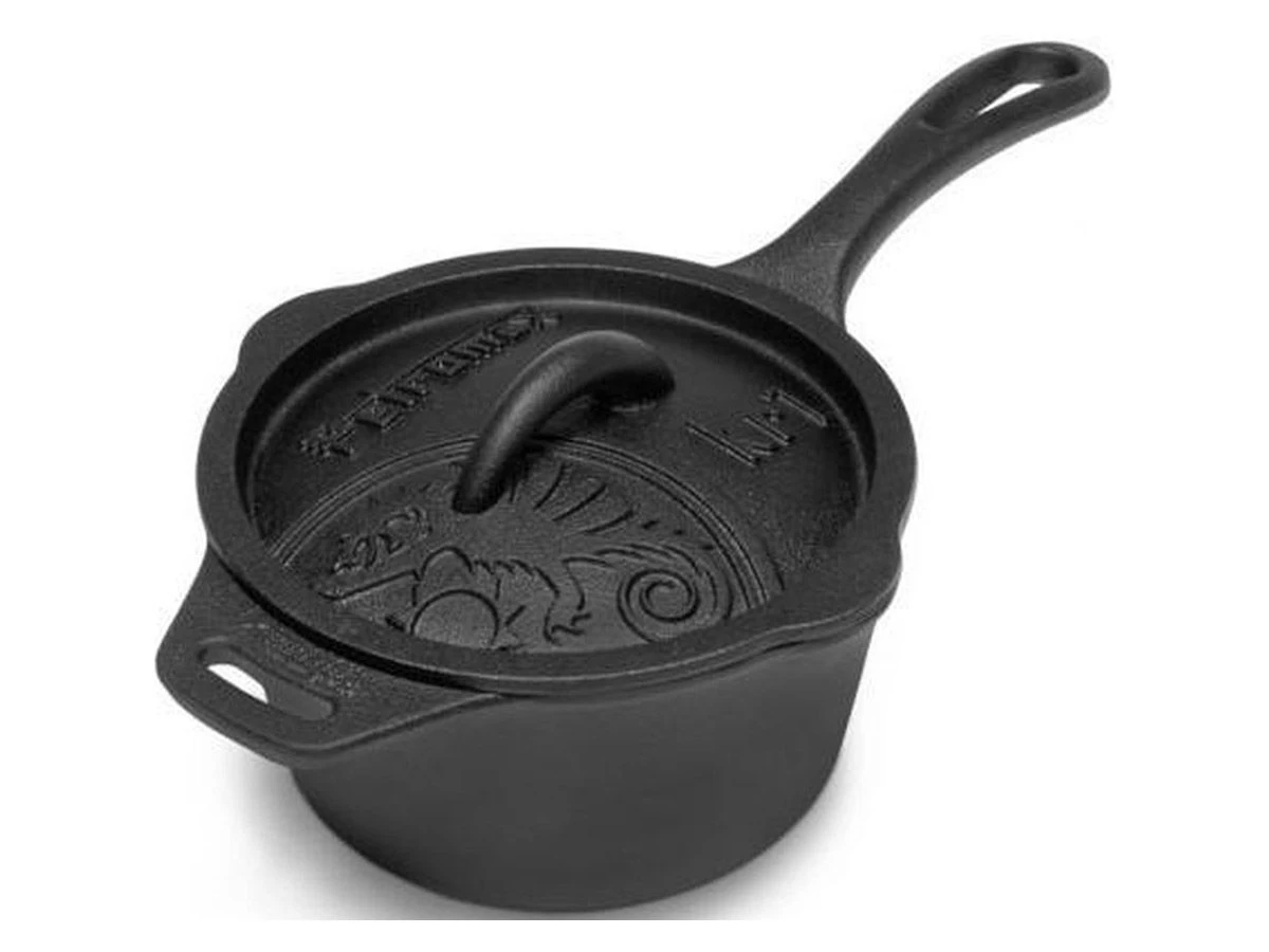 Deze gietijzeren Petromax steelpan met deksel is ideaal voor gestoofde of gekookte vlees- en visvariaties.